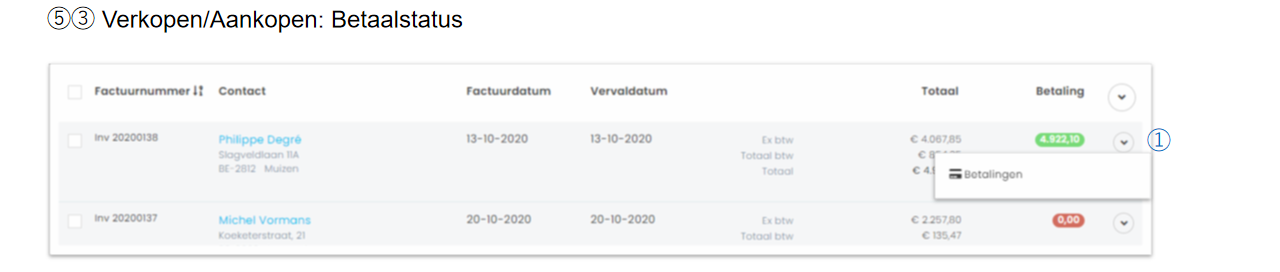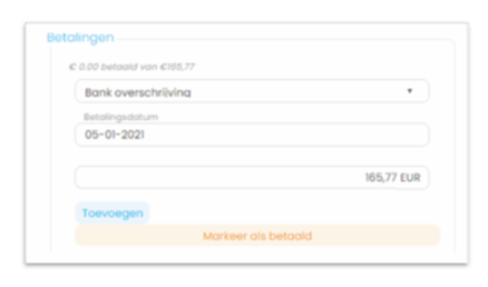 Klik je op het dropdown-pijltje naast het factuurbedrag, dan heb je de mogelijkheid om een betaling manueel in te geven en zo de betaalstatus van de betreffende factuur aan te passen, Je kan hier ook de betaalwijze selecteren.