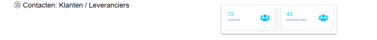 Gebruik deze vakken in het hoofdscherm om door te klikken naar het scherm met je contacten. Je krijgt dan een overzicht van de contacten die de tag klant of de tag leverancier hebben. Meer over contacten vind je op de volgende slides: