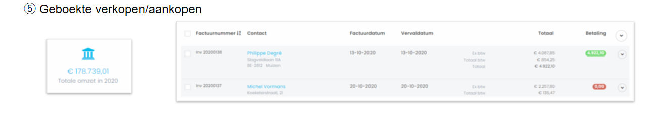 Van zodra je dossierbeheerder je aan- of verkoopfacturen heeft verwerkt, verschijnen ze hier. Verwerkt je dossierbeheerder ook het financieel (voor vennootschappen) dan wordt met een kleur ook de betaalstatus van het document weergegeven. Groen is betaald, Rood is onbetaald. Oranje duidt op een gedeeltelijke betaling van het document.